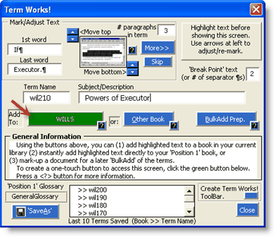 Highlighted text you want to add. Active the Term Works! screen. Type the name of the clause using the prefix/suffix style. Pathagoras will automatically 'sense' the name as being in the prefix/suffix style and will re-point the green button to the proper book.